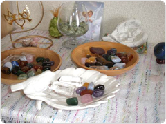 【2】 ベッドに寝ていただき,チャクラにクリスタルを置いて,エネルギーを流していきます。